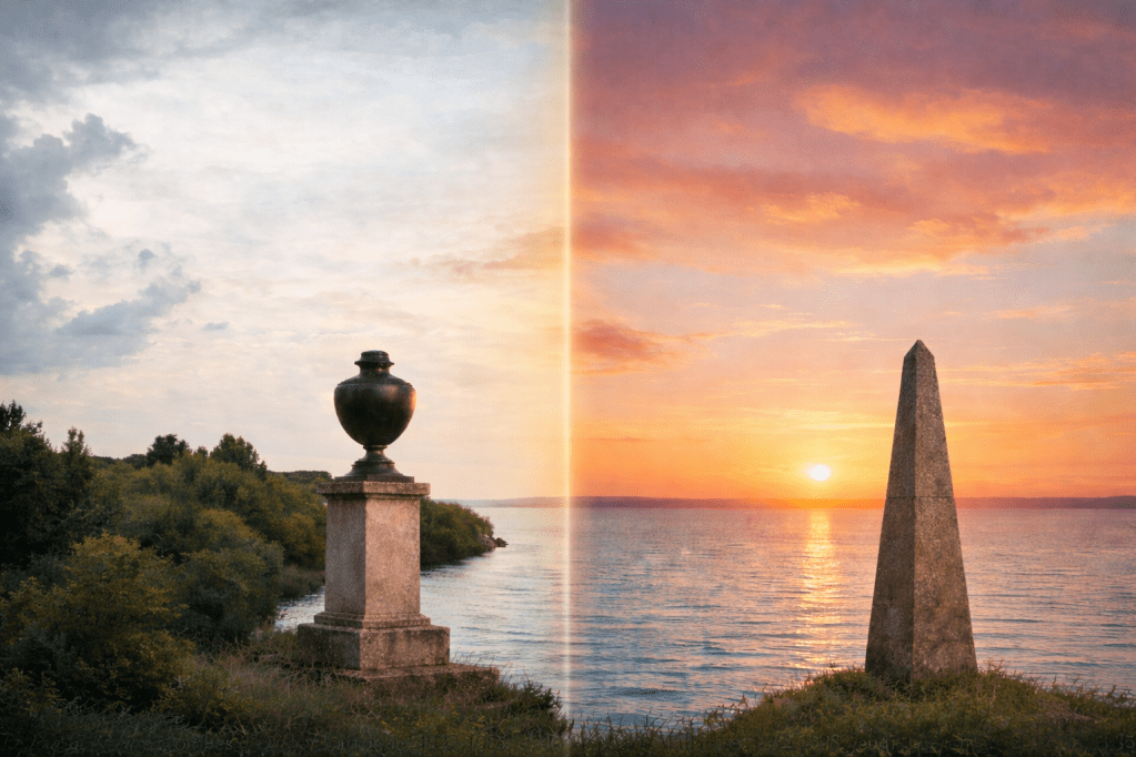 L’obélisque (Larronde), face à la mer, capte l’énergie du soleil levant et est relié par le méridien Sud – Nord qui sépare l’image comme un pont entre la vitalité méditerranéenne et le repos poétique / vase funéraire sous le ciel d’Île-de-France (Mallarmé). C’est une belle résonance symbolique !