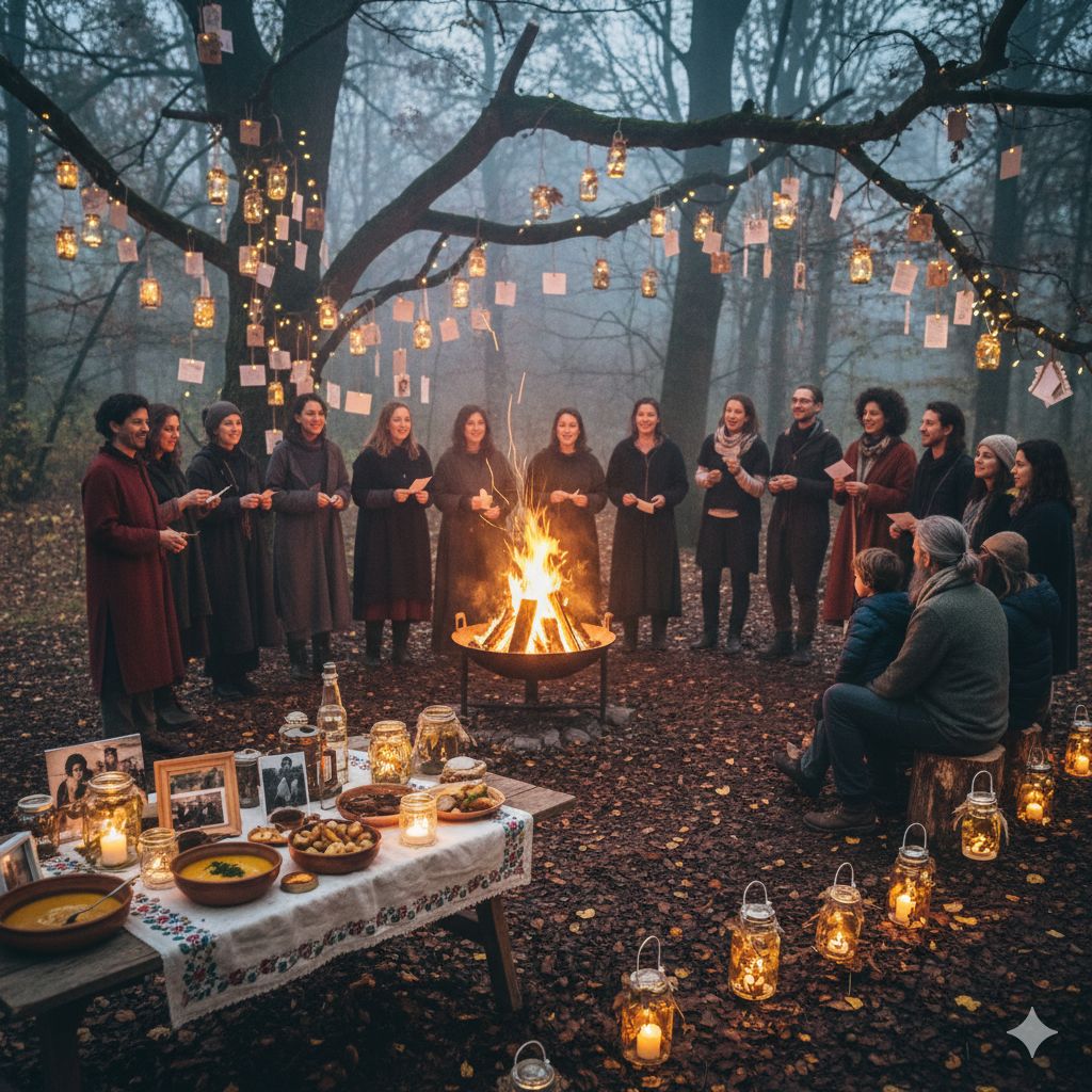 C’est une excellente idée de fusionner les enjeux de Samhain et de la Toussaint dans un événement laïc, la Fête de l’Entrée en Hiver. Voici quelques propositions pour un événement riche de sens qui incarnent la convergence laïque des enjeux de Samhain (transition, fin des récoltes, ouverture vers l’hiver) et de la Toussaint (mémoire, héritage).