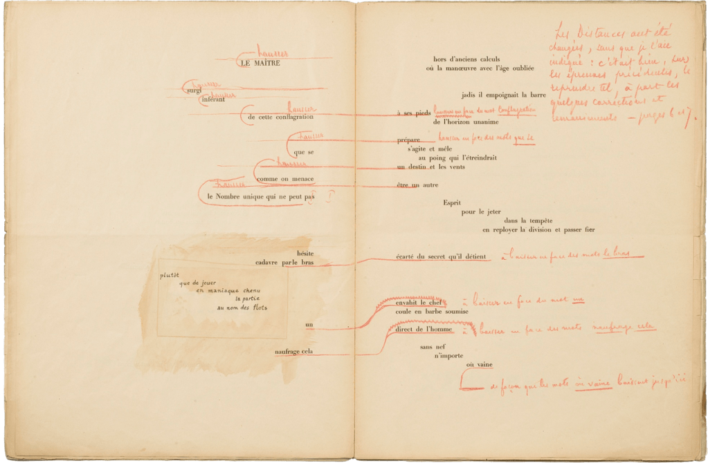 La restitution de la composition typographique a été établie à partir des jeux d’épreuves conservés à la Bibliothèque nationale de France et provenant de la collection Pierre Bérès, en tenant compte des corrections manuscrites de Mallarmé qui mentionne comme titre final : Jamais un coup de dés n’abolira le hasard. Des illustrations de Redon, quatre nous sont parvenues.