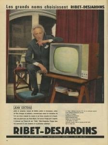Cocteau pose ainsi en 1960, dans son entresol parisien, pour les téléviseurs Ribet-Desjardins. On le voit près d’un modèle « Delta » dans Paris-Match, près d’un modèle « Sidéral » dans Plaisir de France.