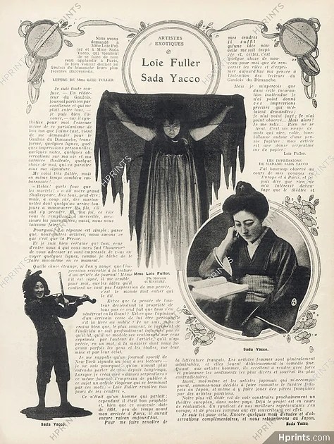 Sada Yacco a fortement marqué le monde de la scène occidentale. Si nous avons déjà évoqué Loïe FULLER, célèbre pour les voiles qu’elle faisait tournoyer dans ses chorégraphies (photo de droite) et qui, tombée sous le charme de ses interprétations, a contribué à sa célébrité en France en l’invitant dans son théâtre, il en est dit-on de même avec une autre danseuse américaine, aidée à ses débuts en Europe en 1899 par la même L. FULLER mais qui, dès 1902, la dépassa largement en terme de renom international : l’immense Isadora DUNCAN. Laquelle aurait souvent fait référence au style et au talent de Sada Yacco