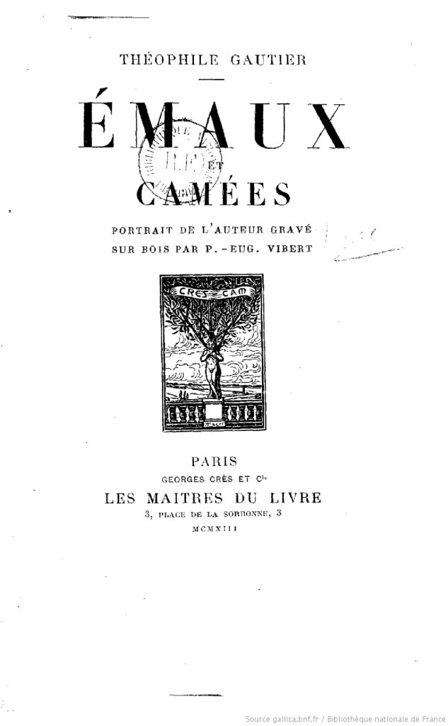 En 1852, paraît Émaux et Camées, recueil de vers qu’il enrichit jusqu’en 1872 et qui fait de son auteur un chef d’école : Baudelaire dédie ses Fleurs du mal au « poète impeccable » et Théodore de Banville salue le défenseur de L’Art pour l’art, précurseur des Parnassiens à la recherche du beau contre les épanchements lyriques des romantiques et valorisant le travail de la forme (« Sculpte, lime, cisèle » écrit Gautier dans son poème L’Art, dernière pièce de Émaux et Camées, édition de 1872).