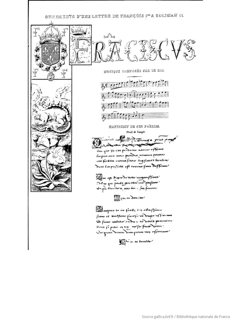 François Ier, surnommé le « roi-poète », a composé plus de cent poèmes, influencés par Pétrarque et l’Arioste. Ses Œuvres poétiques (éd. 1984) mêlent galanterie et ambition politique, visant à transposer la grandeur antique en France (translatio studii).
