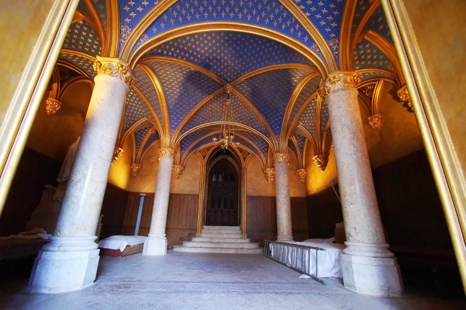 Une plongée dans l’ambiance médiévale, évoquant l’histoire la plus ancienne du château : bienvenue dans l’étonnant vestibule Saint-Louis.