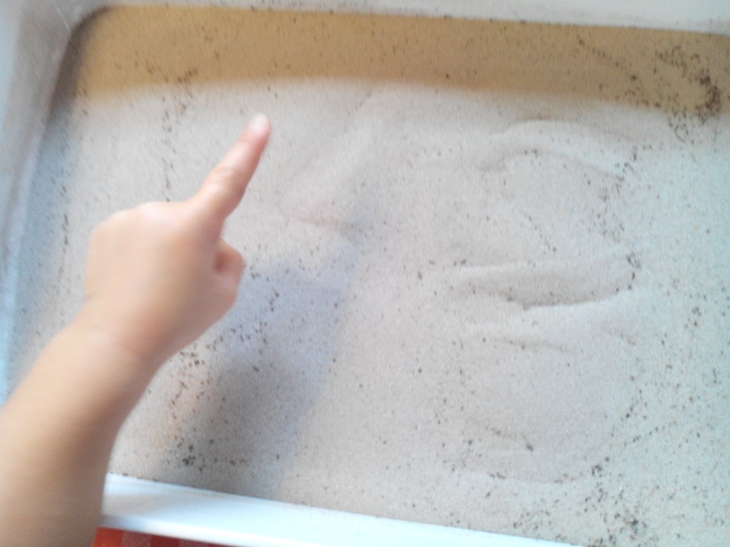 Par l’utilisation du bout de son doigt, caressant le sable, l’enfant imprime le tracé correct de la lettre en utilisant ses sens : tactiles: le toucher mais aussi visuel.