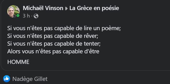 Merci de votre remarque qui m’a permis de proposer ici une réflexion critique. Dommage que plein d’autres poèmes que j’ai pu publier sur FB et que je trouve personnellement très réussis, ne provoquent jamais aucune réaction et donc c’est au moins le mérite de ce poème de l’avoir permis. Ce qui montre qu’il faut donc aussi savoir être lourd de nos jours pour interpeller (ce qui est logique puisque Céline nous l’a bien dit : « les hommes sont lourds »). Puis aussi, pour continuer à pilonner, je dirai que ce poème s’adresse tout autant – et peut-être encore plus – aux poètes modernes qui sont incapables de sortir du « poème dans le livre » pour aller dans le « poème de la vie » ou la poétisation du monde, une chose que j’affirme après plus de 20 ans à OUVRIR des chemins poétiques tout a fait inédits et de grande ampleur dans le monde sans que jamais aucun n’en comprennent simplement le sens. Donc, en fait, de nos jours, et voilà ce qui pour le coup est réellement tragique, ce sont les poètes eux-mêmes qui, pour moi, ne sont plus HOMMES !