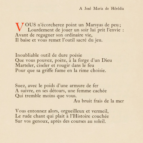 Il était donc tout à fait normal que Degas ait dédié un de ses poèmes, et celui qui ouvre le recueil de 1914, à la figure d’un des chefs du parnasse et un de ses amis les plus proches, José-Maria de Heredia. Le texte de ce sonnet est le suivant :