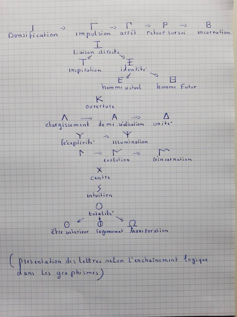 Cette lettre nous permet d’introduire le mot Psyché ΨυΧη , qui peut être compris comme « l’action de la conscience supérieure, dans un état de réceptivité, au centre de l’être Ψ+Χ ». Elle y construit « l’être psychique ». Dans ce livre, ce terme désignera donc ce corps qui grandit au fil des incarnations successives autour du germe de l’« âme ». Ces termes, « âme » et « psychique », ne seront donc pas employés dans le sens habituel. « L’âme est une étincelle du feu de l’Absolu au cœur de l’être manifesté. Elle descend dans la manifestation afin de soutenir son évolution. L’être psychique (ou individualité d’âme), Psyché, est formé par l’âme au cours de son évolution. Il soutient le mental, le vital et le corps, croît par leurs expériences, porte la nature de vie en vie. Il est d’abord voilé par le mental, le vital et le corps, mais au cours de sa croissance, il devient capable de venir en avant et de dominer ces plans de l’être ».