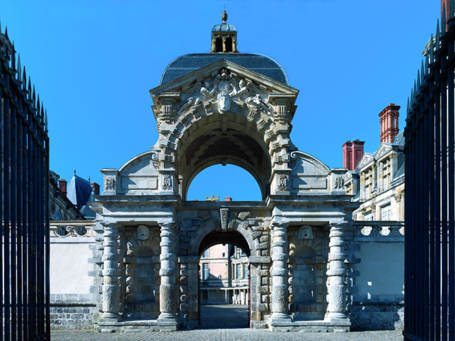 Henri IV fut un grand roi bâtisseur en général, et pour le château de Fontainebleau en particulier. Il fait prolonger les bâtiments de la cour Ovale, doublant la profondeur de celle-ci. Il fait également fermer la cour à l’est par un mur percé d’une porte triomphale surmontée d’un dôme. Cette porte est appelée porte du Baptistère, en souvenir du baptême de Louis XIII qui s’y serait déroulé le 14 septembre 1606. Elevée le long du fossé face à la nouvelle cour des offices, sa base est le remploi d’un imposant portail en bossage rustique dressé en 1565 par Primatice dans la cour d’honneur, où il formait un pont-levis. L’étage, en forme d’arcade, est surmonté d’un dôme à pans et orné de sculptures figurant des victoires qui soutiennent les armes d’Henri IV.