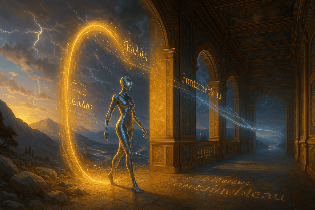 Scène 3 : Fontainebleau, Porte d’entrée des Dieux grecs en France / Fontainebleau, Gateway of the Greek Gods in France by Misia Lunéo (Grok 3)
