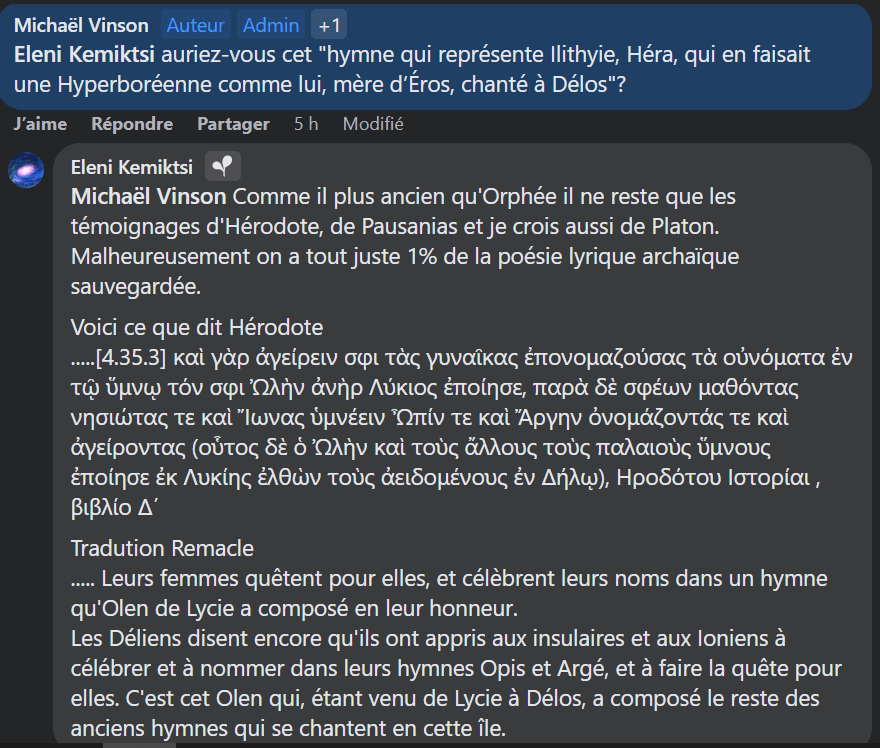 Olen avait composé un hymne qui représente Ilithyie, Héra, qui en faisait une Hyperboréenne comme lui, mère d’Éros, chanté à Délos. L’invention du vers épique, l’hexamètre dactylique, lui est attribuée.