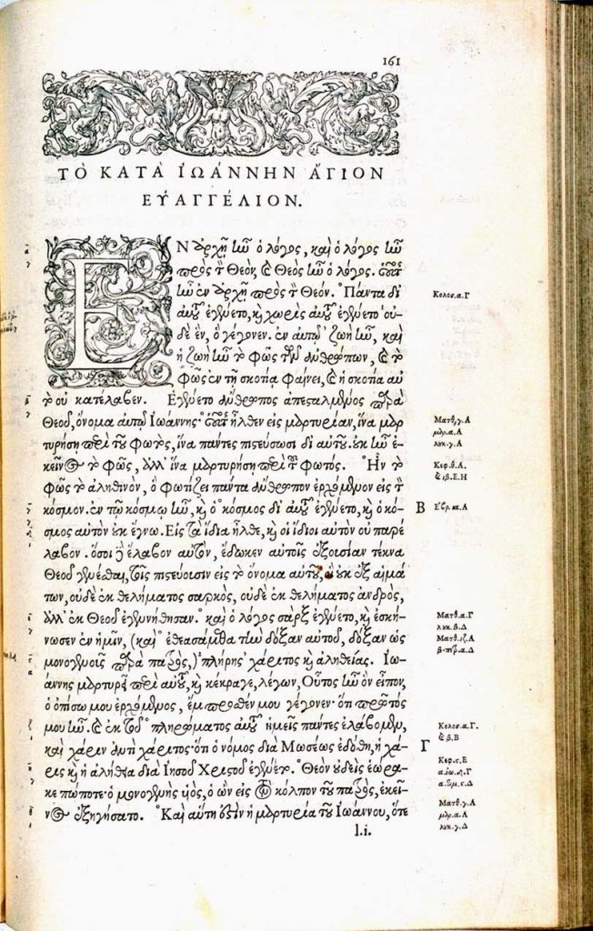 Ἐν ἀρχῇ ἦν ὁ λόγος, καὶ ὁ λόγος ἦν πρὸς τὸν Θεόν, καὶ Θεὸς ἦν ὁ λόγος. 2 οὗτος ἦν ἐν ἀρχῇ πρὸς τὸν Θεόν. 3 πάντα δι’ αὐτοῦ ἐγένετο, καὶ χωρὶς αὐτοῦ ἐγένετο οὐδὲ ἕν ὃ γέγονεν. 4 ἐν αὐτῷ ζωὴ ἦν, καὶ ἡ ζωὴ ἦν τὸ φῶς τῶν ἀνθρώπων, 5 καὶ τὸ φῶς ἐν τῇ σκοτίᾳ φαίνει, καὶ ἡ σκοτία αὐτὸ οὐ κατέλαβεν. 6 ἐγένετο ἄνθρωπος ἀπεσταλμένος παρὰ Θεοῦ, ὄνομα αὐτῷ Ἰωάννης 7 οὗτος ἦλθεν εἰς μαρτυρίαν, ἵνα μαρτυρήσῃ περὶ τοῦ φωτός, ἵνα πάντες πιστεύσωσι δι’ αὐτοῦ. 8 οὐκ ἦν ἐκεῖνος τὸ φῶς, ἀλλ’ ἵνα μαρτυρήσῃ περὶ τοῦ φωτός. 9 ἦν τὸ φῶς τὸ ἀληθινόν, ὃ φωτίζει πάντα ἄνθρωπον ἐρχόμενον εἰς τὸν κόσμον. 10 ἐν τῷ κόσμῳ ἦν, καὶ ὁ κόσμος δι’ αὐτοῦ ἐγένετο, καὶ ὁ κόσμος αὐτὸν οὐκ ἔγνω. 11 εἰς τὰ ἴδια ἦλθε, καὶ οἱ ἴδιοι αὐτὸν οὐ παρέλαβον. 12 ὅσοι δὲ ἔλαβον αὐτόν, ἔδωκεν αὐτοῖς ἐξουσίαν τέκνα Θεοῦ γενέσθαι, τοῖς πιστεύουσιν εἰς τὸ ὄνομα αὐτοῦ· 13 οἳ οὐκ ἐξ αἱμάτων, οὐδὲ ἐκ θελήματος σαρκός, οὐδὲ ἐκ θελήματος ἀνδρός, ἀλλ’ ἐκ Θεοῦ ἐγεννήθησαν. 14 καὶ ὁ λόγος σὰρξ ἐγένετο, καὶ ἐσκήνωσεν ἐν ἡμῖν (καὶ ἐθεασάμεθα τὴν δόξαν αὐτοῦ, δόξαν ὡς μονογενοῦς παρὰ πατρός), πλήρης χάριτος καὶ ἀληθείας. 15 Ἰωάννης μαρτυρεῖ περὶ αὐτοῦ, καὶ κέκραγε λέγων, Οὗτος ἦν ὃν εἶπον, Ὁ ὀπίσω μου ἐρχόμενος ἔμπροσθέν μου γέγονεν· ὅτι πρῶτός μου ἦν. 16 καὶ ἐκ τοῦ πληρώματος αὐτοῦ ἡμεῖς πάντες ἐλάβομεν, καὶ χάριν ἀντὶ χάριτος. 17 ὅτι ὁ νόμος διὰ Μωσέως ἐδόθη, ἡ χάρις καὶ ἡ ἀλήθεια διὰ Ἰησοῦ Χριστοῦ ἐγένετο. 18 Θεὸν οὐδεὶς ἑώρακε πώποτε· ὁ μονογενὴς υἱός, ὁ ὢν εἰς τὸν κόλπον τοῦ πατρός ἐκεῖνος ἐξηγήσατο.