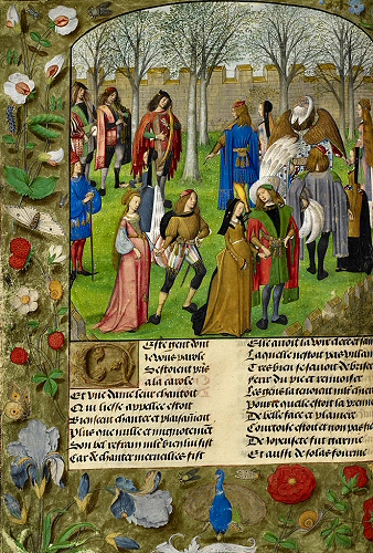Dynamisé par l’Orient, le thème littéraire du jardin d’amour, difficile d’accès, se mit à fleurir chez nous, le plus célèbre exemple en étant peut-être celui décrit par Guillaume de Loris dans la première partie du Roman de la Rose ( vers 1225-1230) :