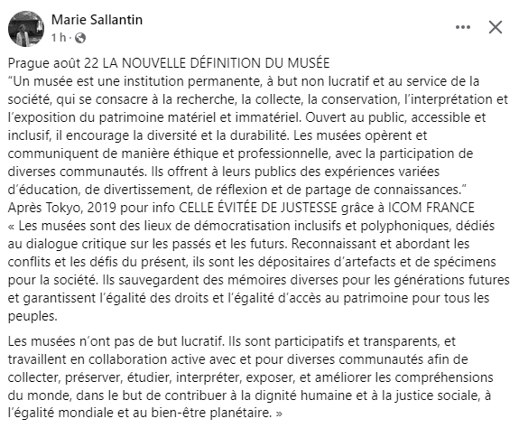 « Les musées sont des lieux de démocratisation inclusifs et polyphoniques, dédiés au dialogue critique sur les passés et les futurs. Reconnaissant et abordant les conflits et les défis du présent, ils sont les dépositaires d’artefacts et de spécimens pour la société. Ils sauvegardent des mémoires diverses pour les générations futures et garantissent l’égalité des droits et l’égalité d’accès au patrimoine pour tous les peuples.
