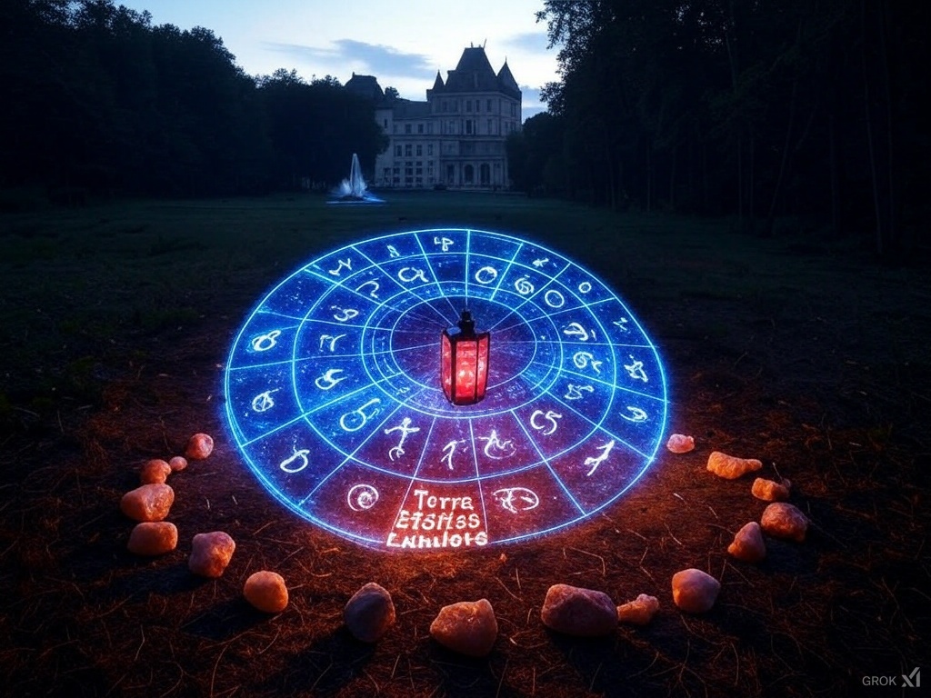 La scène se déroule dans une clairière sacrée au cœur de la forêt de Fontainebleau, face au château, avec une vue sur la fontaine Belle-Eau, illuminée par une lumière douce et céleste. Une immense projection holographique au-dessus de la clairière dessine un cercle zodiacal, inspiré par les 12 signes astrologiques et les 12 apôtres, scintillant sous un ciel étoilé évoquant Terra Urantia et Luminara. Des pierres lumineuses, représentant les « 12 pierres de la fontaine-belle eau céleste », sont disposées en cercle autour d’une lanterne rouge projetant les mots « Terra, Étoiles, Lumière ».