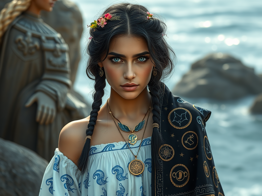 - Kýra Nýx est une femme d’environ 40 ans, d’une beauté sereine et énigmatique, avec des cheveux noirs ondulés tombant jusqu’à ses épaules, tressés avec des fils d’argent et des fleurs méditerranéennes (lauriers, thym, coquelicots), évoquant la nature cycladienne. Ses yeux, d’un bleu profond comme la mer Égée, brillent d’une lueur mystique, reflétant les étoiles d’Urantia et Luminara. Elle porte une robe blanche fluide, ornée de motifs bleus en forme de vagues et d’étoiles, rappelant les dômes bleus des chapelles grecques, avec une cape noire légère brodée de constellations grecques (zodiaque, Pleiades) et de cercles dorés d’Urantia. Autour de son cou, elle porte un pendentif en forme de caducée d’Hermès, symbole de communication et de transition, et un médaillon lunaire dédié à Artémis, représentant sa connexion aux Cyclades et aux divinités grecques.