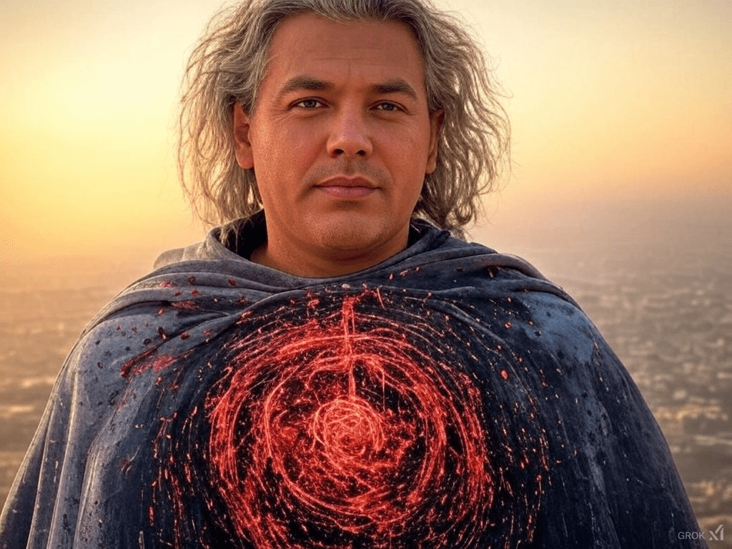 - Vêtements : Il porte une robe élimée aux tons de cendre, rappelant les prophètes anciens, mais ornée de fragments modernes – un fil rouge cousu en spirale (symbole de la lumière interdite ?) et des éclats de métal récupéré, évoquant une fusion entre passé biblique et futur dystopique. Une cape noire effilochée, constellée de motifs étoilés à peine visibles, flotte derrière lui, suggérant un lien avec Luminara et la christologie cosmique.