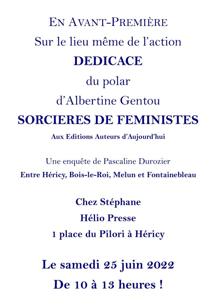 Samedi 25 juin 2022, dédicace du polar d’Albertine Gentou SORCIERES DE FEMINISTES à Héricy