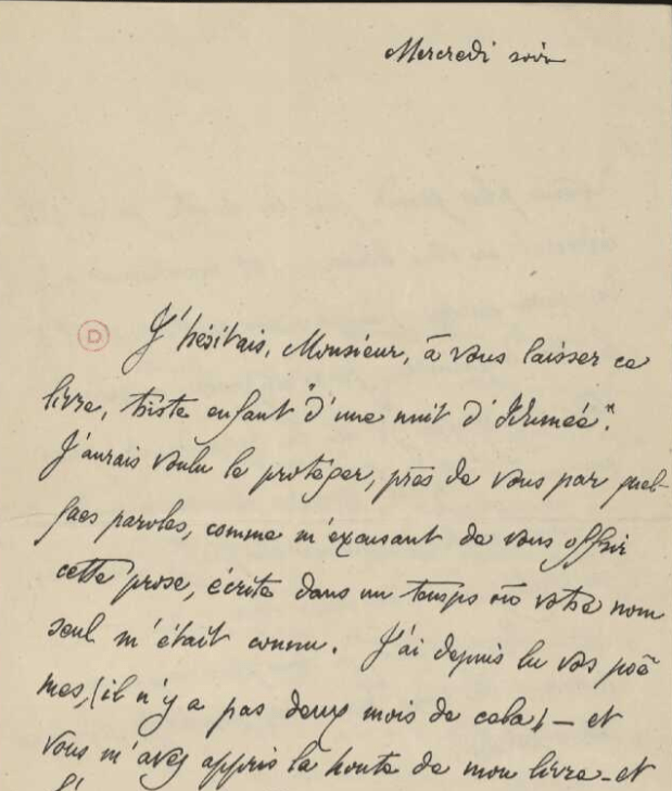 Car, si étrange qu’il paraisse, ce n’est pas seulement par tout ce qu’il dit, que s’affirme un poète, ce n’est pas tant par tout ce qu’il dit, que <par tout> ce qu’il tait. Et si Verlaine, par exemple, a pris dans notre poésie cette place considérable; s’il a joué, sans trop s’en rendre compte et comme enfantinement, le rôle d’un véritable initiateur, c’est parce que ces accents ineffablement suaves que déjà chez Hugo (et pas chez Hugo seul du reste, mais aussi bien chez Lamartine, chez Mme Desbordes-Valmore, chez Baudelaire surtout) nous surprenions par instants, lui les fait entendre à l’exclusion de tous les autres, à l’exclusion aussi de cette rhétorique qui jusqu’à présent faisait l’ossature de notre poésie, [3] de ce développement oratoire qui formait l’épine dorsale de tout poème et même, à peu d’exceptions près, de la plus fugitive chanson.