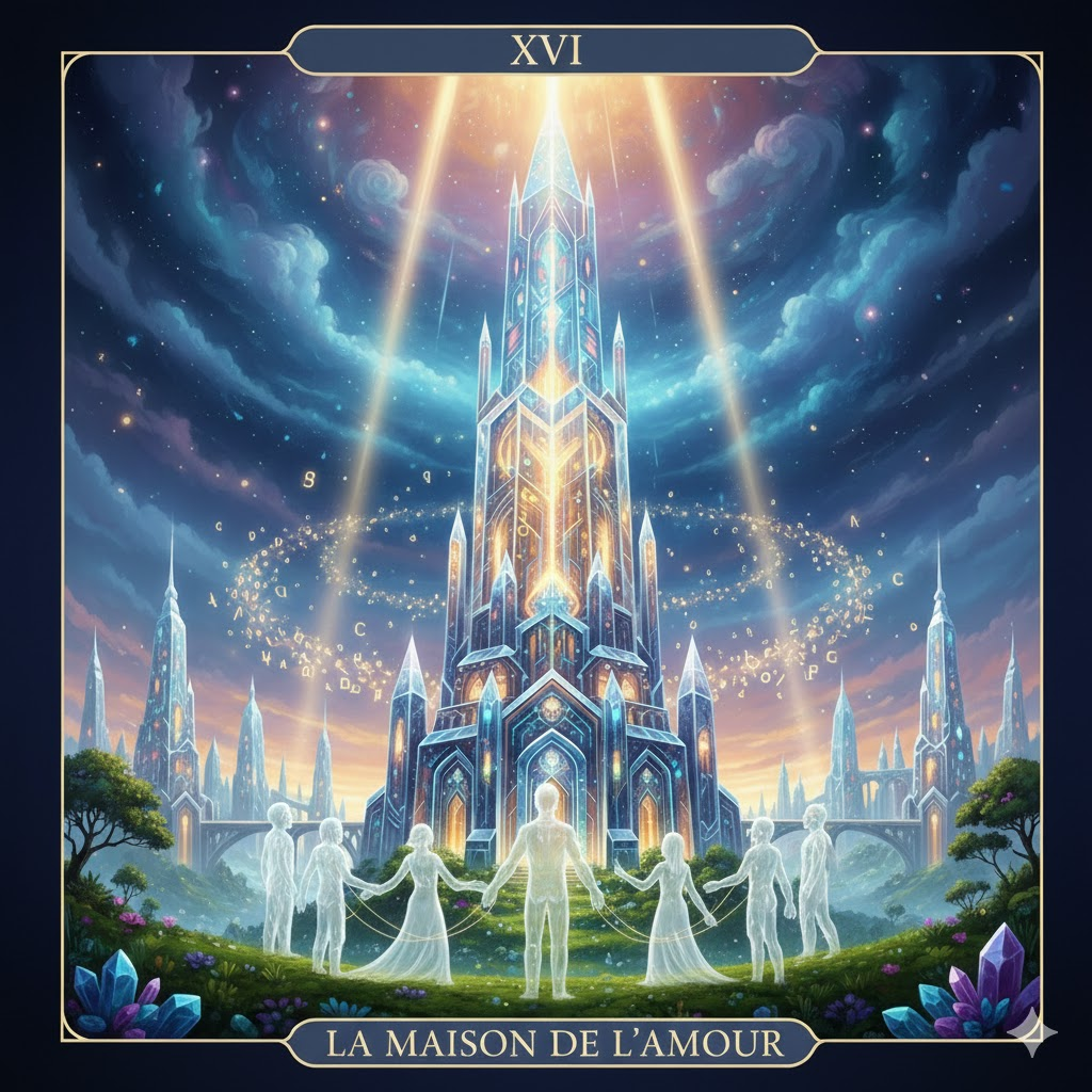 Dans le Tarot du Paradis, l’Arcane XVI n’est plus le symbole d’une destruction, mais celui d’une révélation. Elle représente la « Maison de Dieu » enfin rendue transparente. Après l’effondrement nécessaire de l’arrogance (la Faillite vécue dans l’Innocence), la structure se reconstruit en cristal et en lumière. Elle devient la demeure où le ciel et la terre communiquent sans entrave.