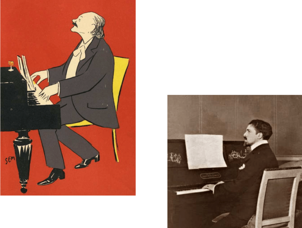 Caricature par Sem, publicité pour la Bénédictine, c. 1900 / Photographie publiée dans Musica (février 1910)