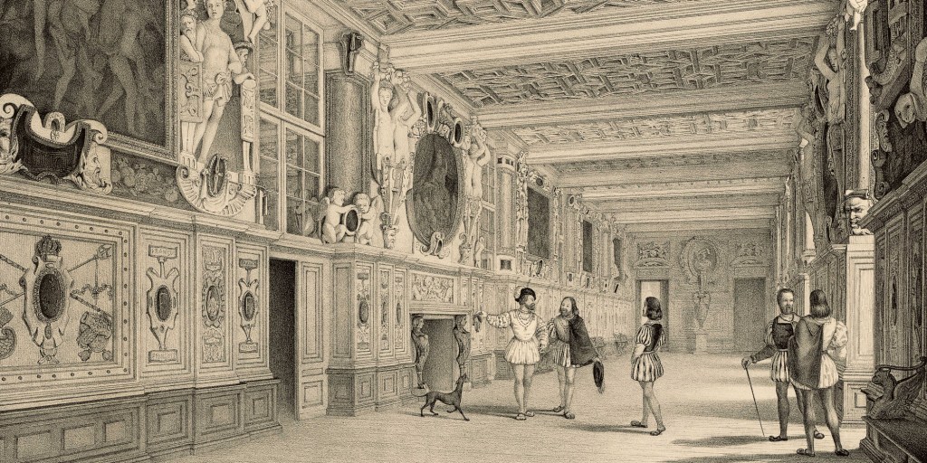En 1657, le château de Fontainebleau est le théâtre d’un sanglant événement. La Reine Christine de Suède, accueillie en France par le cardinal Mazarin, y aurait fait assassiner son grand écuyer, Giovanni Monaldeschi, soupçonné de trahison. Ce dernier est désormais enterré à l’église d’Avon et sa cotte de maille et son épée sont toutes deux conservées au château de Fontainebleau. Sur ce tableau, Christine de Suède tend à Monaldeschi les lettres qui le mettent en cause, tandis que ce dernier, à genoux, implore son pardon. Tous deux sont vêtus à la mode du milieu du XVIIe siècle. Au fond, le château de Fontainebleau sert de cadre à la scène : aussi les souches de cheminées arborent-elles le F de François Ier.