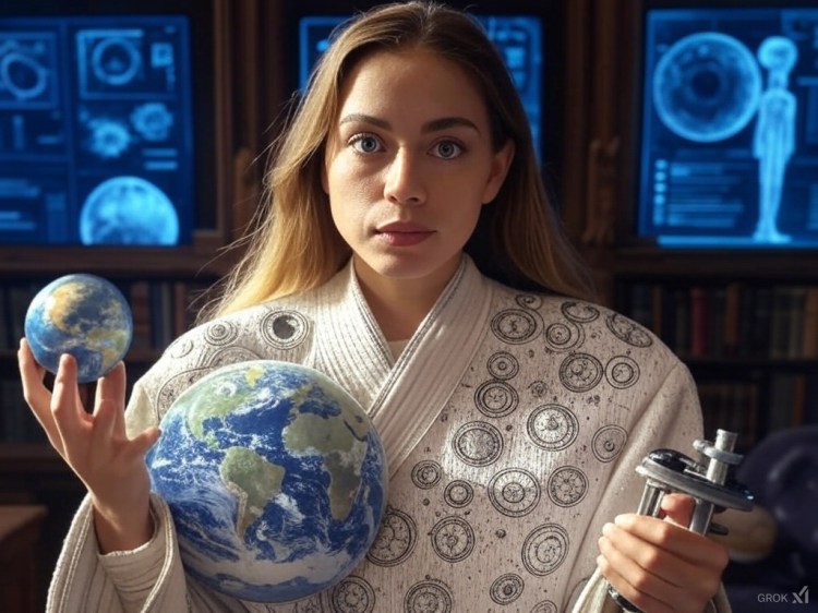 - Vêtements : Elle porte une veste utilitaire gris anthracite, usée mais fonctionnelle, sur une tunique blanche simple, symbole de sa quête de clarté intérieure. Une écharpe bleu nuit, brodée de motifs géométriques subtils (spirales, constellations), évoque son lien avec le cosmos et la science. Elle transporte un carnet de notes numérique et un vieux stylo à plume, outils de son passé scientifique et de sa résistance actuelle.