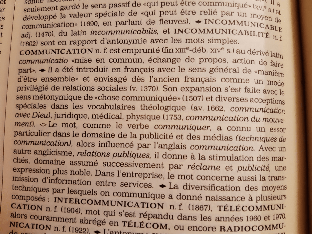LES TERMES « COMMUNIQUER » ET « COMMUNICATION » viennent – tout comme les termes plus anciens « communier » et « communion » – du verbe latin communicare qui signifie selon la définition qu’en donne le Gaffiot : « Mettre ou avoir en commun ».