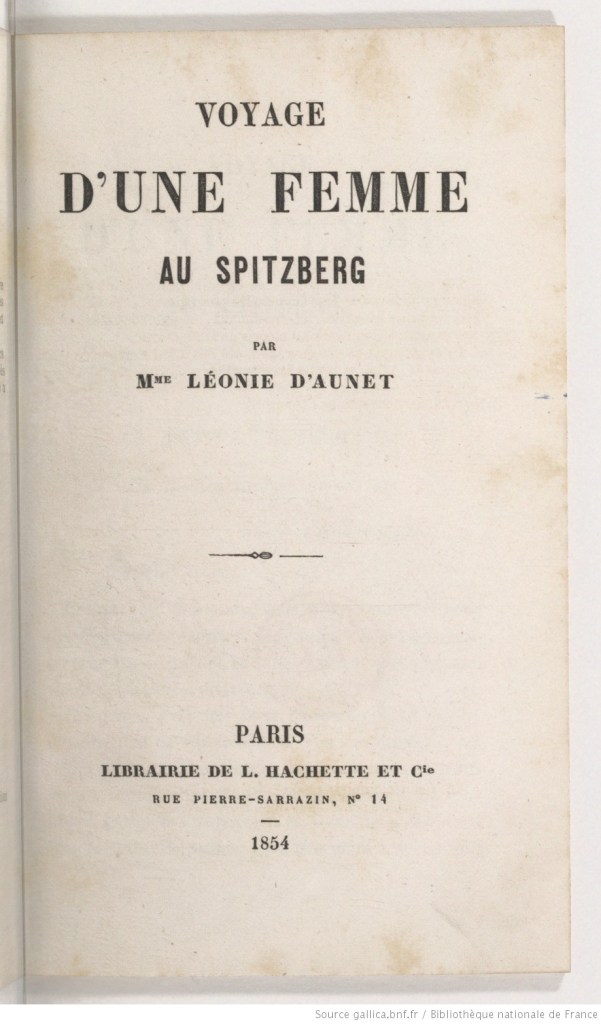 Léonie d’Aunet fut mariée à Paris, le 23 juillet 1840, au peintre François-Auguste Biard. Lorsque son futur mari est engagé dans l’expédition scientifique au Spitzberg (1838-1839), montée pour explorer l’océan Arctique à bord de la corvette La Recherche, sous la direction de Joseph Paul Gaimard, elle défie l’opposition unanime qu’elle rencontre, en annonçant sa résolution de l’accompagner. Elle traverse avec lui la Belgique, la Hollande, la Norvège avant de quitter Hammerfest, la ville la plus septentrionale de Scandinavie, pour aborder, après plusieurs semaines, le Spitzberg. Son début dans les lettres est sa publication, sous forme de feuilleton dans la Revue de Paris, de la relation de cette expédition scientifique aux régions boréales, qu’aucune femme n’a entreprise avant elle.