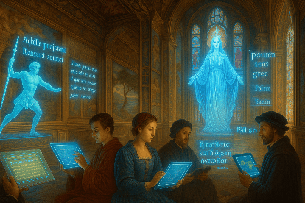• Exemple : Une fresque d’Achille, animée en RA, s’illumine avec un sonnet de Ronsard narrant la vertu, accompagné d’un psaume en grec koinè, co-créé avec des poètes de Fontainebleau et d’Athènes.