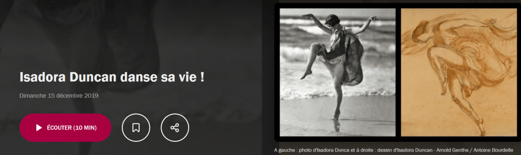Écouter l’émission de France Musique : https://www.radiofrance.fr/francemusique/podcasts/histoires-de-musique/isadora-duncan-danse-sa-vie-5087704