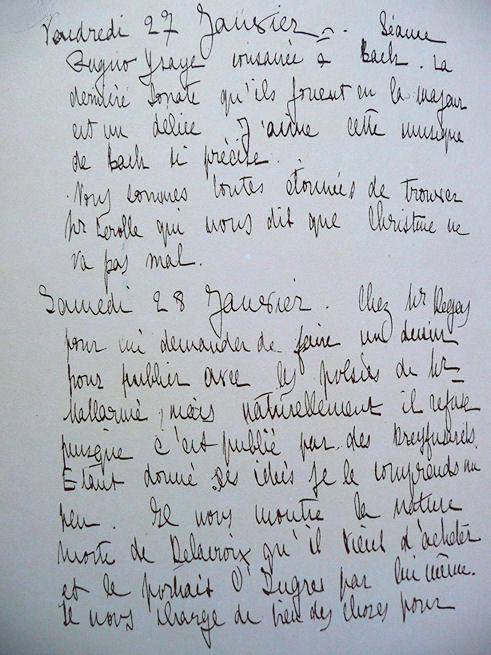Je n’ai encore rien fait aujourd’hui, il me semble que les journées sont trop courtes. Je prends la résolution de me lever plus tôt demain, de travailler et d’être gentille avec Maman. Je compte étudier mieux mon violon, faire beaucoup de gammes et apprendre à ne pas jouer mollement, j’ai horreur de cela.