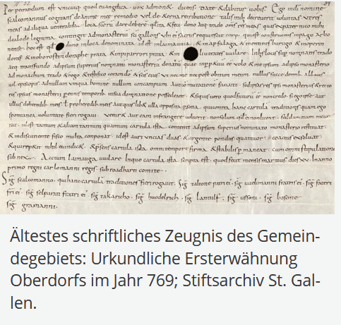 In einer St. Galler Schenkungsurkunde vom 5. September 773 erfährt der Ort Langenargen als „Argona » und „Arguna » seine urkundliche Ersterwähnung. Dieses im St. Galler Urkundenbuch „Codex traditionum » von 1645 erhaltene, im Original jedoch verschollene Dokument wird seinerzeit auf das Jahr 770 datiert, da der Text das zweite Regierungsjahr des Frankenkönigs Karl als Zeitpunkt seiner Ausfertigung benennt. Doch bereits P. Trudpert Neugart, Stiftsarchivar von St. Blasien, gelangt 1791 zu der Auffassung, dass 773 als korrektes Jahr der Urkundenausfertigung anzusehen sei. Grundlage dieser Feststellung dürfte der Sachverhalt sein, dass Karl der Große ab 768 nur das Westfrankenreich regierte. Erst 771 übernahm derselbe auch den Herrschaftsbereich seines verstorbenen Bruders Karlmann. Neugarts Angaben werden durch den von 1948 bis 1981 als St. Galler Stiftsbibliothekar wirkenden Msgr. Prof. Dr. Johannes Duft der ursprünglichen Zählweise im „Codex traditionum » nachgeordnet. Dadurch ist es zu erklären, dass Langenargen im Jahr 1970 auf der Grundlage der damaligen Interpretation dieser Urkunde seiner 1200-jährigen urkundlichen Ersterwähnung gedenkt – das 1250-jährige Jubiläum wegen des neuesten Forschungsstandes, welcher die Zählweise Neugarts wieder übernimmt, jedoch erst auf 2023 festzulegen ist. Unbestritten war und bleibt hingegen die urkundliche Ersterwähnung Oberdorfs als „Operindoraf » im Jahr 769, welche ebenfalls aus einer Schenkungsurkunde an das Kloster St. Gallen hervorgeht.