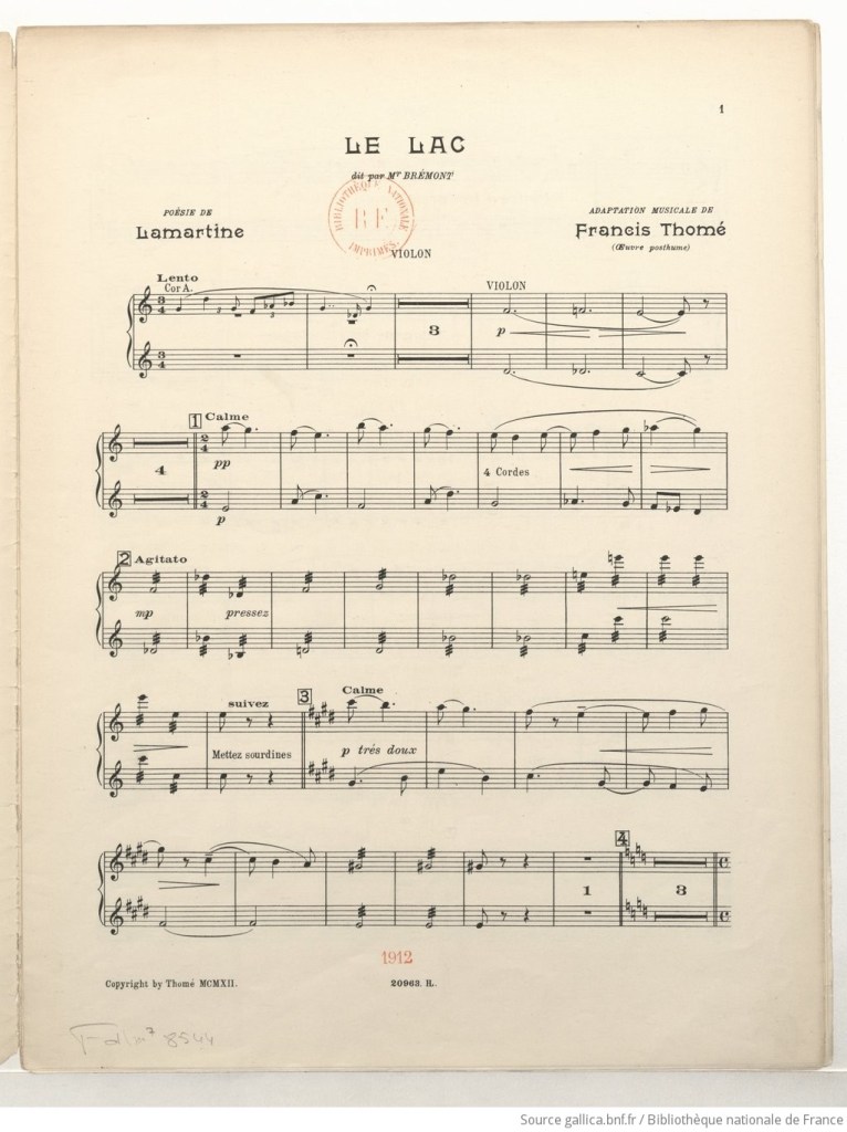 Titre : Le Lac, poésie de Lamartine, adaptation musicale par Francis Thomé, (oeuvre posthume), piano et violon ad libitum