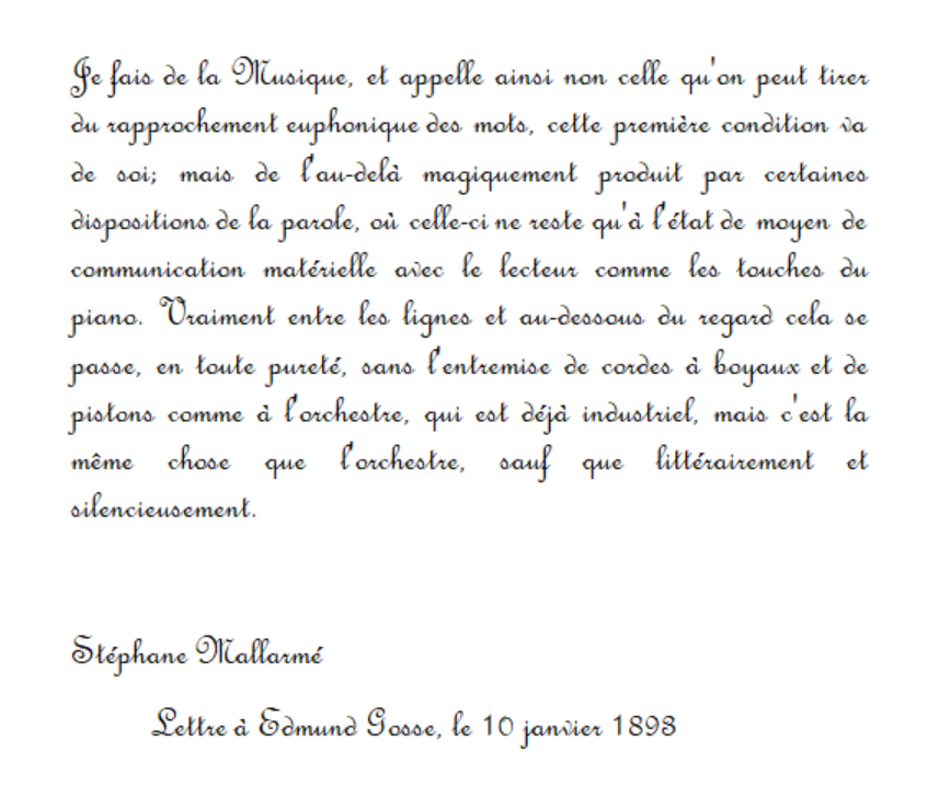 J’emprunterai ces mots à ce dernier pour conclure : « Si la musique en tant que telle, n’aura jamais été le souci de Mallarmé, il aura toujours manifesté une extrême tension à son égard ».