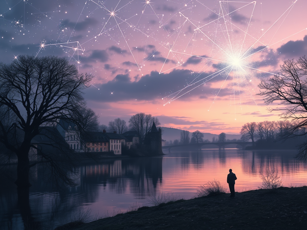 Une scène surréaliste de la Seine au crépuscule, reflétant un ciel empli d’étoiles scintillantes et de portails interdimensionnels lumineux. Au premier plan, le village bohème de Bois-le-Roi avec ses arbres anciens oscillant dans le vent, baigné de teintes douces argentées et violettes. Une atmosphère poétique, mêlant le mystique et le naturel, avec de vagues traces de la silhouette d’un poète près de l’eau. (IA WordPress)