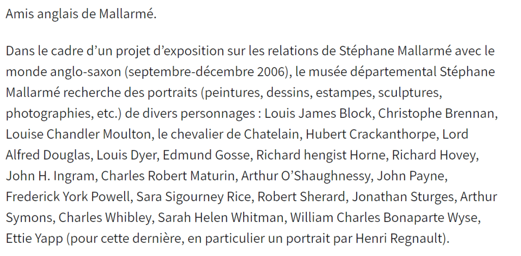 Exposition : Les relations de Stéphane Mallarmé avec le monde anglo-saxon au Musée départemental Stéphane Mallarmé La Tribune de l’Art samedi 4 février 2006 https://www.latribunedelart.com/exposition-les-relations-de-stephane-mallarme-avec-le-monde-anglo-saxon-au-musee-departemental