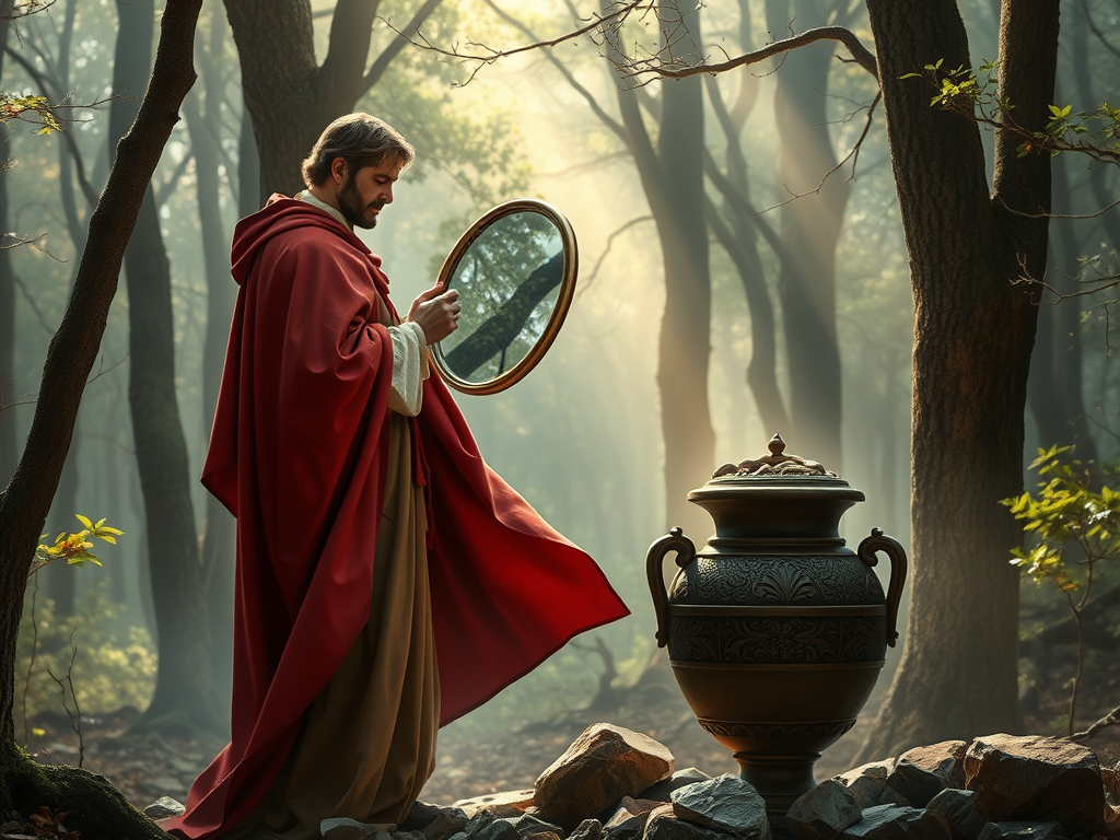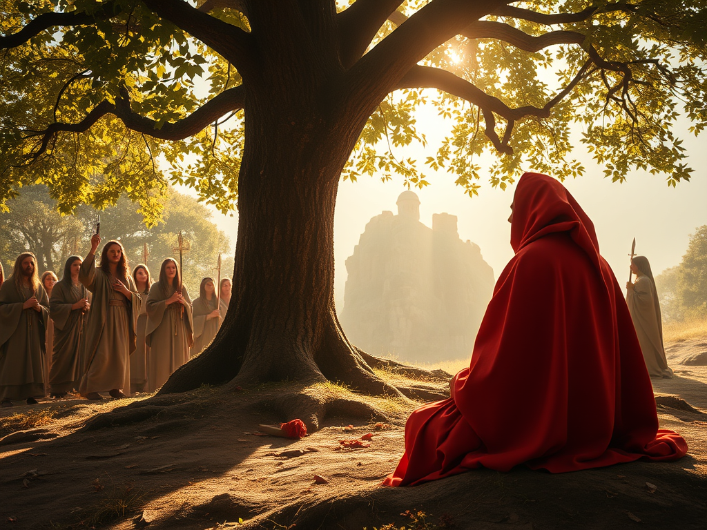 - Théâtre chrétien – Le choix de Martin : Saint Martin, cape rouge au vent, apparaît comme une vision, tenant son miroir. Il dit : « Pèlerins, deux voies s’ouvrent : l’une rapide vers Langenargen, l’autre profonde vers Tours. Choisissez non pour la distance, mais pour l’amour – la forêt vous appelle, comme elle m’appela autrefois à prier sous les chênes.» Sophia, par une voix douce, ajoute : « La forêt murmure, Urantia écoute. Quel chemin écrira votre pas ? » Les pèlerins, en silence, déposent un galet dans une urne – un pour Langenargen, un pour Tours – et la majorité choisit la forêt, symbolisant une quête intérieure.