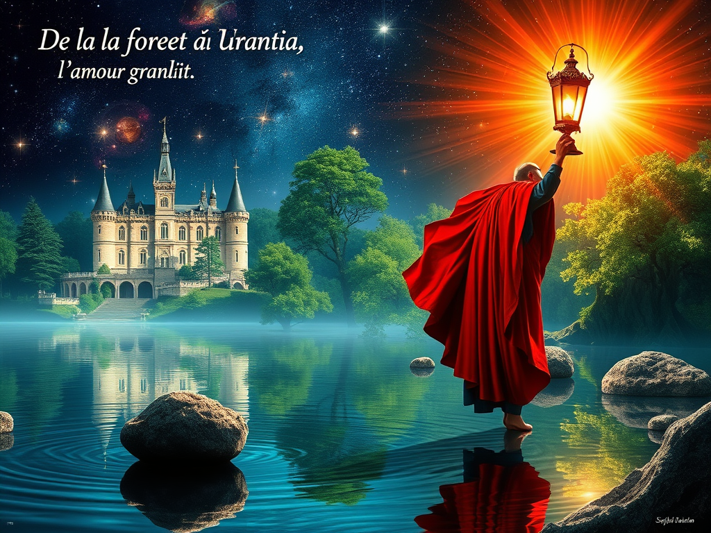 De Martin à Urantia, l’amour brille, sans échec.* Ce poème, traduit en allemand par Anna, est accompagné d’une feuille gravée d’un taureau, d’une étoile et d’un chêne. - Théâtre mythologique : Une troupe joue une scène où Diane (déesse grecque de la chasse, présente dans les fresques du château) dialogue avec Saint Martin et Elyra. Diane dit : « Chasse les ombres, Martin – ta cape et ma lumière unissent la forêt et les étoiles.» Elyra ajoute : « De Luminara, je vois : la mythologie grecque et Urantia chantent un paradis écologique.» Les pèlerins, guidés par Anna, dansent une chorégraphie inspirée de la Renaissance, formant un cercle zodiacal.