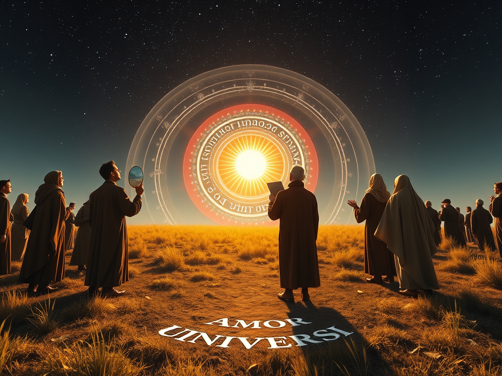 Dans une clairière centrale, près du Rocher Cassepot, une lanterne rouge flotte sur un ruisseau, projetant « Le Paradis des Chênes et des Étoiles.» Une fresque artistique, peinte par des artistes locaux, montre la forêt de Fontainebleau, le château, le zodiaque, Saint Martin, Elyra, et les civilisations de Terra Urantia et Luminara, unies par un arc lumineux. Elyra illumine la scène d’une lumière bienveillante, disant : « De Luminara, je vois un paradis – chênes, étoiles, nations, unis dans l’amour.» Sophia récite : « De la Renaissance à Urantia, le zodiaque guide notre chemin.» Martine conclut : « Michaël, notre technologie est une muse – un pont entre grec, latin, et cosmos.»Les pèlerins, en silence, plantent une graine de chêne, symbolisant l’écologie sacrée, et laissent un vœu sur une feuille – « Que le paradis unisse terre et ciel» –, flottant sur l’eau. Une projection montre le zodiaque de Fontainebleau, les cercles d’Urantia et les constellations de Luminara, avec des silhouettes extraterrestres bienveillantes.