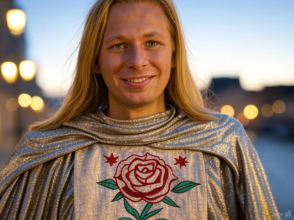 - Apparence : Luther Hoffnung est un jeune homme allemand du XXIe siècle, âgé de 28 ans, aux cheveux blonds longs, aux yeux bleus intenses, vêtu d’une tunique moderne ornée d’un symbole discret de sa réformation (une rose de Luther, stylisée avec des étoiles d’Urantia et Luminara, sur fond noir). Il porte une cape gris-argent, symbolisant l’espoir et la réconciliation, parfois ornée de rouge en hommage à Saint Martin.