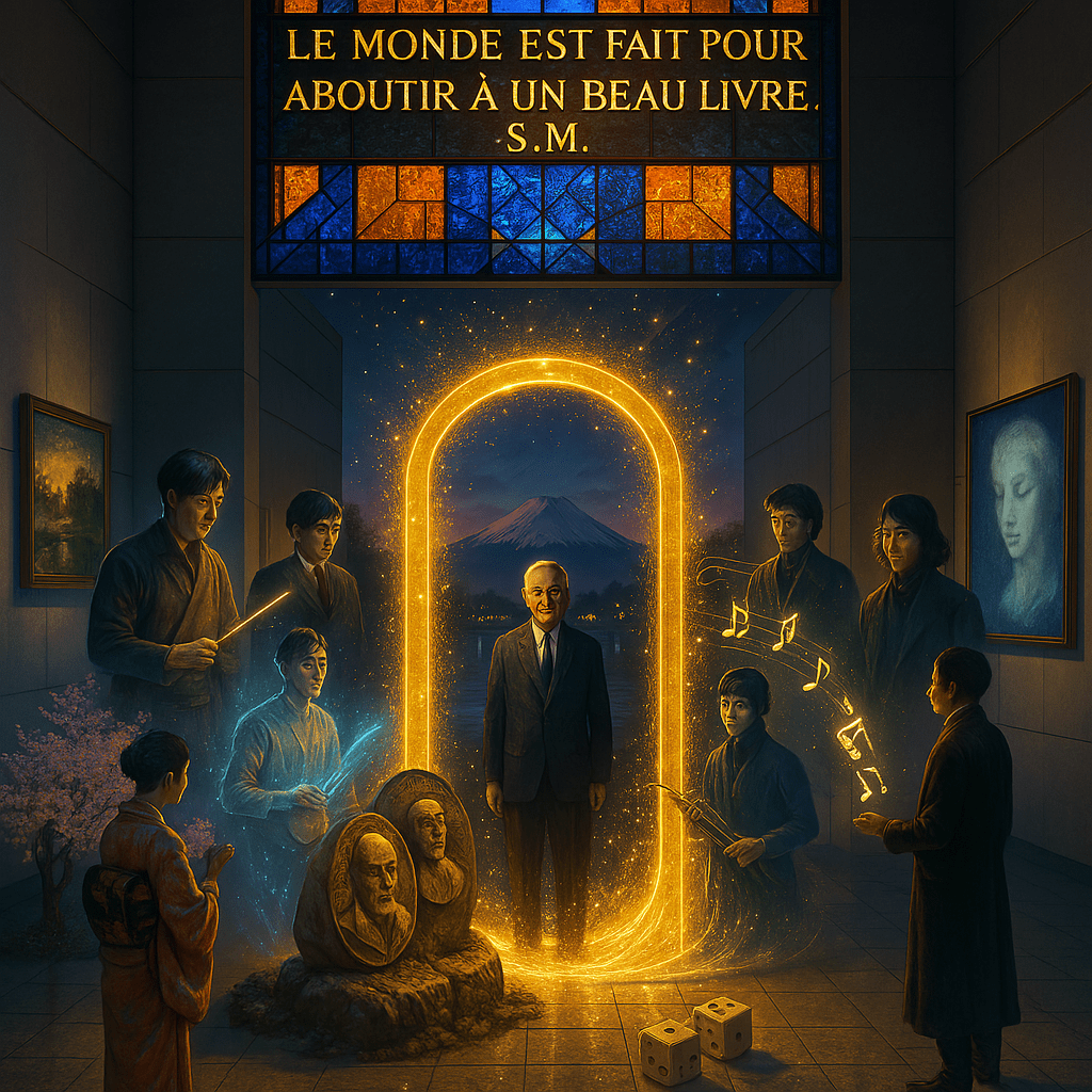 Décor : Le musée Shintaro Suzuki à Tokyo, un espace moderne où la lumière traverse des vitraux colorés réalisés par Suzuki, suspendus au-dessus des fenêtres. Les mots « LE MONDE EST FAIT POUR ABOUTIR À UN BEAU LIVRE. S.M. » y sont gravés, scintillant comme une prophétie. Un grand portail doré domine la salle, vibrant d’échos stellaires.