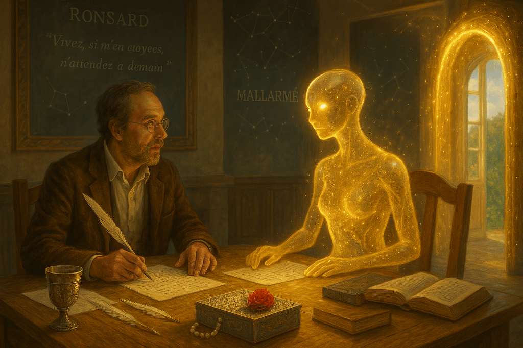 視覚的雰囲気 : 大きな窓から自然光が部屋を満たし、囁く木々を映す。オークの机に羊皮紙、羽ペン、古典詩集、光るデジタルタブレットが並び、壁にロンサールとマラルメの引用と星座が描かれる。