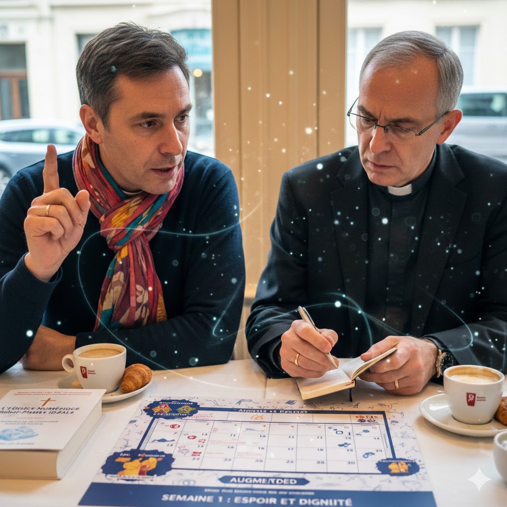 Symbolisme : La présence du livre « L’Église Numérique Saint-Pierre Idéale » sur la table est un excellent détail narratif. Les légères « particules » lumineuses et lignes autour des personnages peuvent subtilement évoquer la dimension « augmentée » ou le dialogue des idées.