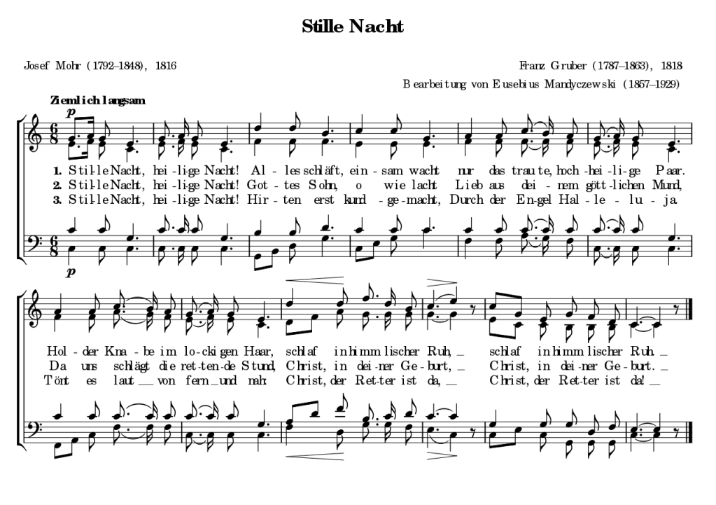 Stille Nacht, heilige Nacht ist eines der bekanntesten Weihnachtslieder der Welt und gilt als Inbegriff des Weihnachtsbrauchtums im deutschen Sprachraum.