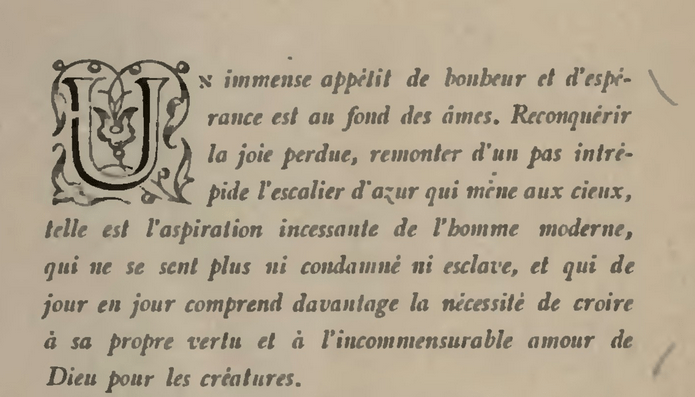 Aussi peut-on poser comme un axiome que l’athéisme, ou négation de notre essence divine, amène nécessairement à la suppression de tout lyrisme dans ce qu’aux époques athées on nomme à tort : la poésie. C’est pourquoi cette prétendue poésie, comme l’a prouvé tout le XVIIIe siècle, est une chose morte, un cadavre.