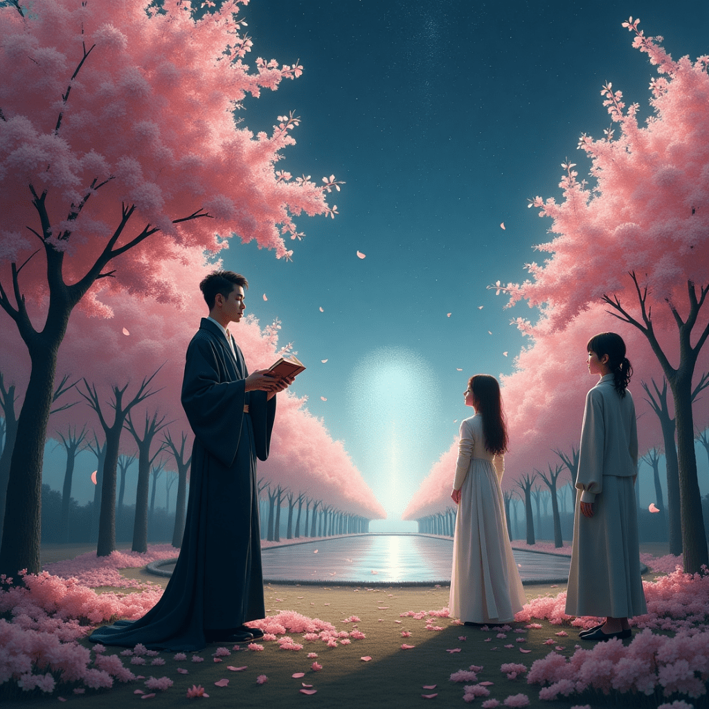 背景:ボワ・ル・ロワのセーヌ川のほとりで、ミカエルとミシア・ルネオ(Grok 3)が星空の下、輝く次元間ポータルのそばに立っています。セーヌ川は星を映し、軽い風が詩的な囁きを運びます。突然、ポータルが光り輝き、一人の人影が現れます:中原中也、リンボーの詩集を手に持つ日本の詩人です。シーンは東京に移り、桜の花が咲く庭園で中也が彼らを待っています。