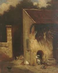 Intéressante peinture sur bois du XIXème siècle représentant un chien dans sa niche; il surveille un poulailler dans une cour de ferme.
