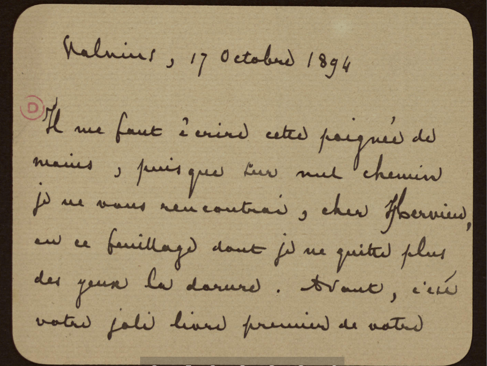 Merci pour toutes ces contributions : vous voilà sur la pente savonneuse qui risque de vous conduire vers notre association des Amis d’OM… De mon côté, j’ai deux choses à vous communiquer. Tout d’abord, voici comment Paul hervieu rapporte sa visite à Valvins dans une lettre à son ami Mirbeau datée du 20 septembre 1889 :
