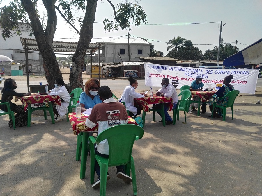 La tente servant de salle d’attente, les chaises et tables installées, les artistes médecins (comédiens pour la plupart), vêtus de blouses blanches, ont commencé à recevoir leurs patients tour à tour. Le but de ces consultations, a expliqué Pierre Claver Mabiala, était d’écouter les personnes (considérées comme  patientes ) pour savoir ce qu’elles avaient comme problèmes personnels, discuter avec elles et leur donner des remèdes à base de mots, capables de les guérir. Ces remèdes ont été des textes des poètes du pays et d’ailleurs, des poèmes en français mais aussi en lingala et kituba, des textes ayant une connotation thérapeutique.